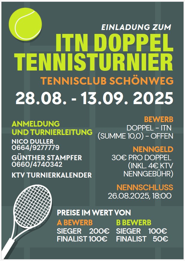 Kürzlich fand zum fünften Mal ein offenes ITN Doppelturnier am Tennisplatz in Schönweg statt. Der Tennisclub konnte sich über eine große Teilnehmerzahl freuen, 36 Paarungen aus ganz Kärnten kämpften um den Turniersieg. Im A-Bewerb konnten sich Paulitsch Kevin (TC Tennisland/TC Wolfsberg) und Knapp Thomas (TG St. Paul) gegen Zoder Tobias (TC St. Michael) und Halbreiner Elias (TC Kern) durchsetzen. Im B-Bewerb freuten sich Talker Wolfgang (TC St. Michael) und Lurz Alexander (ASV St. Margarethen) über den Sieg gegen Spendier Raphael (UTC Raiffeisen St. Stefan) und Duller Nico (Tennisclub Schönweg). Unter den Zahlreichen Besuchern konnten wir Vizebürgermeister Peter Maximilian, Stadtrat Taudes Christian und Tennis Regionalvertreter Thonhauser Bernhard begrüßen.